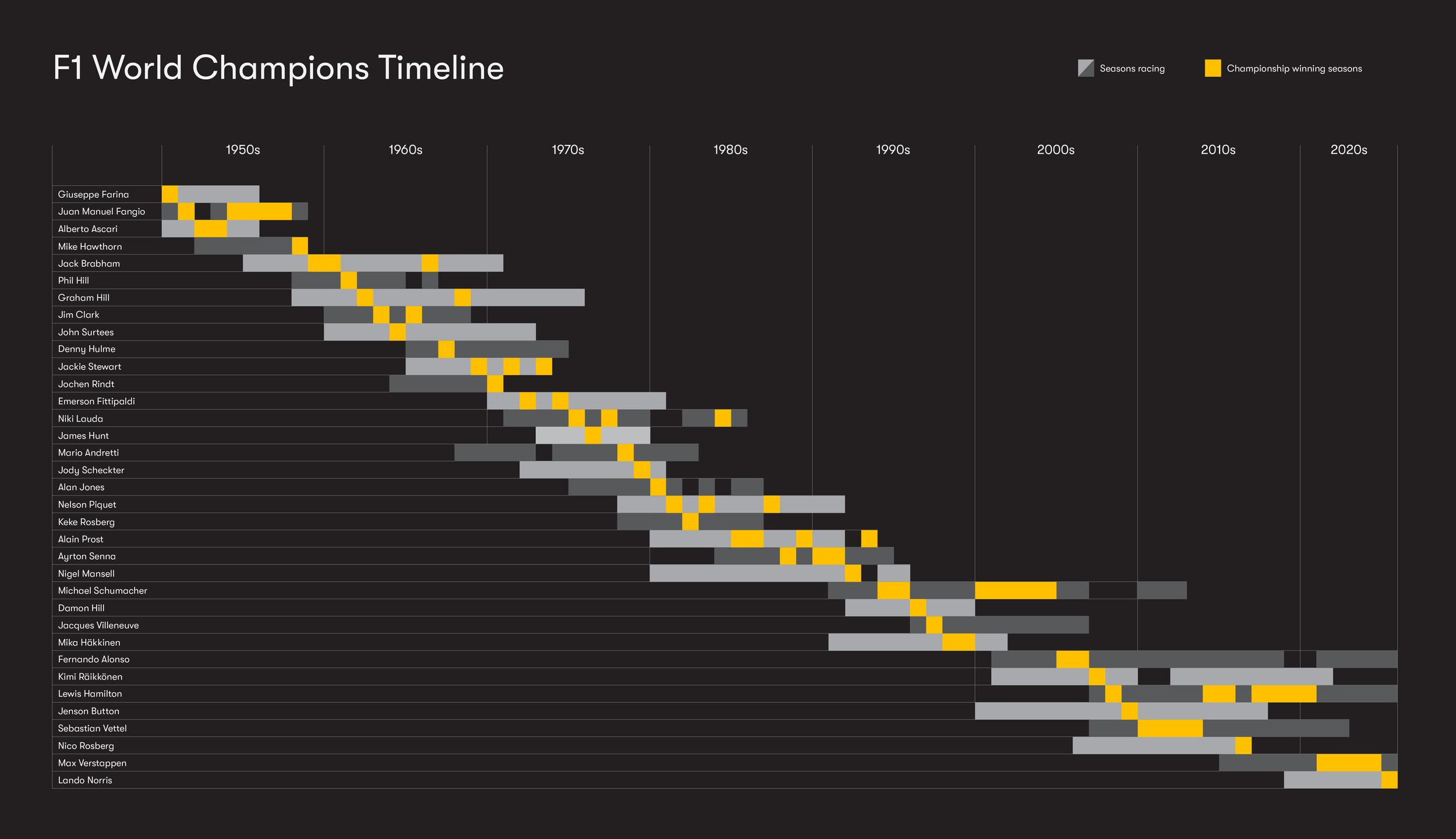 This infographic shows the careers of all 35 F1 world champions from the inaugural season in 1950 through to the 2025 season. It can be used to compare driver’s careers both in terms of longevity and success as well as showing which drivers have competed against each other over the years.